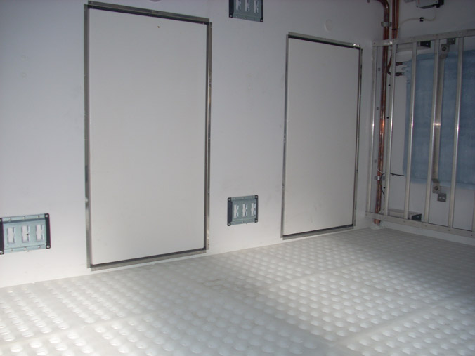 Isolamento construído em painéis de 30 mm de espessura com 40kg/densidade (painéis lisos vidrados). Piso reforçado com contraplacado de 15 mm revestido com fibra de vidro com acabamento com top coat cinza anti-derrapante.